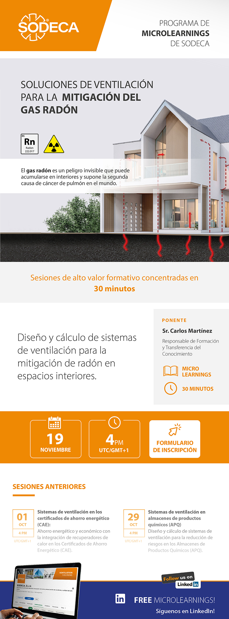 Los microlearnings de SODECA consisten en formaciones en remoto, con ponentes expertos, sobre aspectos en los que la empresa tiene un gran conocimiento. Tienen una duración de media hora, lo que las hace breves y de un alto valor formativo. En esta ocasión, en la formación se abordará el diseño y el cálculo de los sistemas de ventilación para mitigar el radón, un contaminante radiactivo, de origen natural, que surge de la desintegración del uranio. Esta desintegración tiene como consecuencia la emisión de partículas alfa de alta energía, capaces de dañar nuestro ADN y provocar mutaciones y tumores.