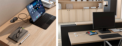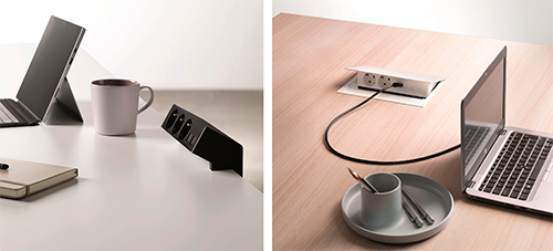 La gama incluye soluciones modulares como Simon 400 In Desk (instalación integrada en mesa), Simon 400 In Desk Duo (de acceso doble para mesas de reuniones), y Simon 400 Top (para instalación superficial), todas diseñadas para facilitar la conexión de dispositivos, gestión de cables y acceso a enchufes y puertos de carga de manera práctica y sin esfuerzo.