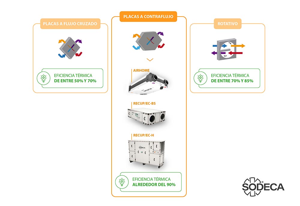 El elemento clave en los recuperadores de calor es el intercambiador. Existen tres tipos según la forma en la que el aire fluye por este componente. Pueden ser intercambiadores rotativos, con placas a flujo cruzado o con placas a contraflujo. De estas tres opciones, la que ofrece una mayor eficiencia térmica es la última, alcanzando una eficiencia de hasta el 90%. El sistema de placas a contraflujo es el que mejor aprovecha y transfiere la energía, el calor o el frío, del aire que se extrae del interior al aire fresco que entra desde el exterior.