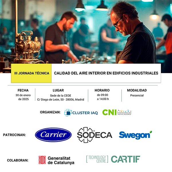 El próximo 30 de enero, el edificio de la CEOE en Madrid acogerá la III Jornada Técnica del organizada por Cluster IAQ y la Confederación Nacional de Instaladores (CNI), un evento clave centrado en la importancia de la Calidad del Aire Interior en los edificios industriales.