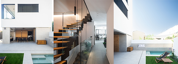 En términos compositivos, la casa presenta un lenguaje moderno, de líneas puras y sencillas, con el blanco de las fachadas y el negro de las carpinterías, formando un contraste abstracto y atemporal. La terraza, en relación con la sala y la cocina-comedor, actúa como otro gran vacío dentro de la fachada, aportando dinamismo al conjunto.