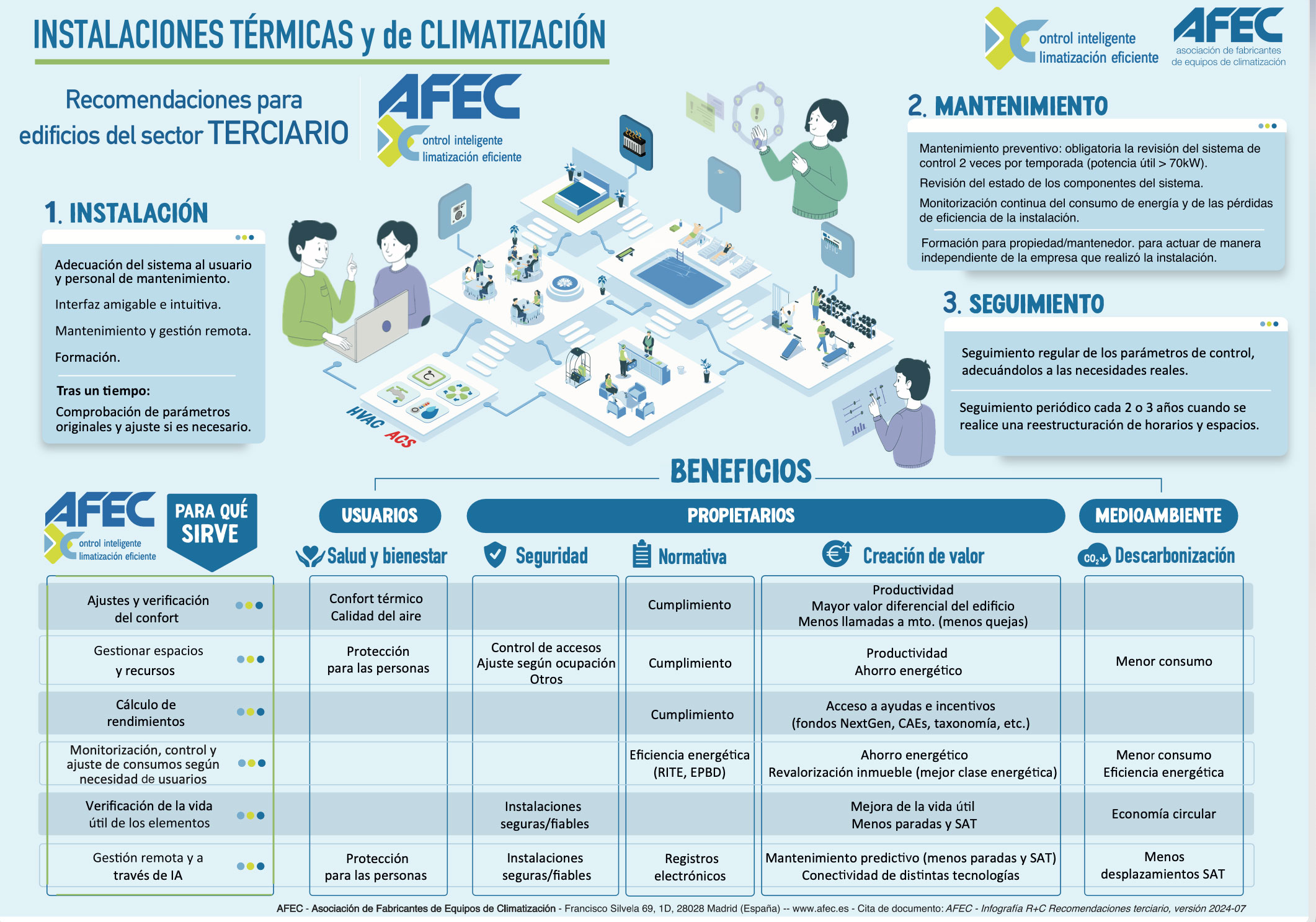 La Asociación de Fabricantes de Equipos de Climatización (AFEC) lanza la infografía Recomendaciones de REGULACIÓN y CONTROL en EDIFICIOS del sector TERCIARIO elaborada por el grupo de trabajo colaborativo intersectorial que impulsa la campaña de comunicación Control inteligente, climatización eficiente.