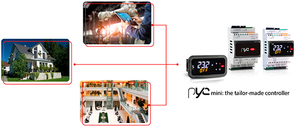 pYC mini es la nueva línea de controladores programables diseñados para satisfacer la creciente demanda de eficiencia, seguridad y versatilidad en aplicaciones HVAC/R. Con una estructura compacta y la flexibilidad que ofrece la programabilidad, pYC mini también cumple con las últimas regulaciones sobre refrigerantes de bajo GWP, incluidos los gases inflamables (A3, A2L). La comunicación serial, disponible de serie en toda la gama, se utiliza para gestionar directamente los principales elementos de la unidad, como válvulas de expansión electrónica, controladores de velocidad de ventiladores e inverters, optimizando así el control y la eficiencia energética. La conectividad inalámbrica permite una configuración rápida e intuitiva mediante la aplicación APPLICA, simplificando la instalación y la monitorización. Por último, también está disponible la integración con sistemas de supervisión, para una monitorización constante y un análisis detallado del rendimiento.