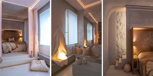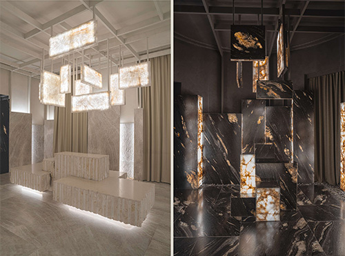 Este lobby multisensorial de Gómez Grau, firma especializada en materiales naturales de alta gama, diseñado por Ramón Esteve Estudio, explora el potencial expresivo de la piedra natural a través de la combinación de diferentes tipos de roca, texturas y contrastes cromáticos, conectando con la naturaleza y las fuerzas que moldean el paisaje. La instalación se divide en dos espacios contrastantes: el primero, claro y envolvente, inspirado en una cantera con bloques pétreos que se transforman en bancos y sofás. El segundo, oscuro y retroiluminado, con cuarcita negra y ónices, evoca un ambiente volcánico. La iluminación de Simon resalta las texturas y contrastes, creando una atmósfera que invita a la contemplación, donde la música y los aromas profundizan la experiencia sensorial.