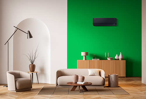 En la zona del salón, Samsung despliega una visión elegante y funcional del hogar conectado. El nuevo modelo WindFree en color negro, recientemente lanzado, aporta una opción sofisticada para quienes buscan climatización inteligente sin renunciar al diseño. Este equipo aprende de los hábitos del usuario y ajusta automáticamente la temperatura para maximizar el confort.