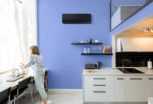 Pero también es un espacio para la climatización: el cassette WindFree de una vía, instalado en el techo, garantiza una ventilación silenciosa y sin corrientes, mientras que el EHS ClimateHub y el Hydrokit mural exponen la solución de aerotermia de Samsung para calefacción, refrigeración y agua caliente sanitaria desde una única unidad, todo ello gestionado digitalmente.