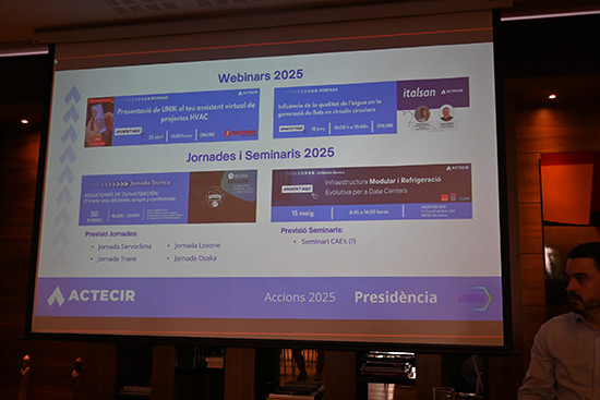A continuación el presidente Gaspar Martín presentó su informe en el que hizo balance de su primer año de mandato. Destacó el éxito alcanzado en los cursos que se han llevado a cabo. La necesidad de ampliar el panel de cursos y webimars que representan una importante fuente de ingresos para la Asociación y un punto fuerte de visión técnica de cara a nuevos socios. Destacó la importancia de que todas las empresas colaboradoras deben involucrarse en este aspecto y participar proponiendo tanto cursos como jornadas técnicas. Dentro del marco de visitas técnicas, Sergi Asensio, comentó el éxito de la visita técnica realizada a la fábrica de Hitachi de Vacarisses este mismo año, con un número reducido de personas de un gran valor técnico y profesional. Asensio comentó que este tipo de jornadas-visita a instalaciones debe fomentarse mas, e invito a los asistentes a que sus empresas promocionen visitas técnicas a sus instalaciones. Dentro del marco lectivo, el presidente destacó la previsión de nuevos cursos y jornadas como la de CAEs y las nuevas alianzas con otras asociaciones como el Cluster IAQ, que generaran nuevas formaciones y/o colaboraciones.