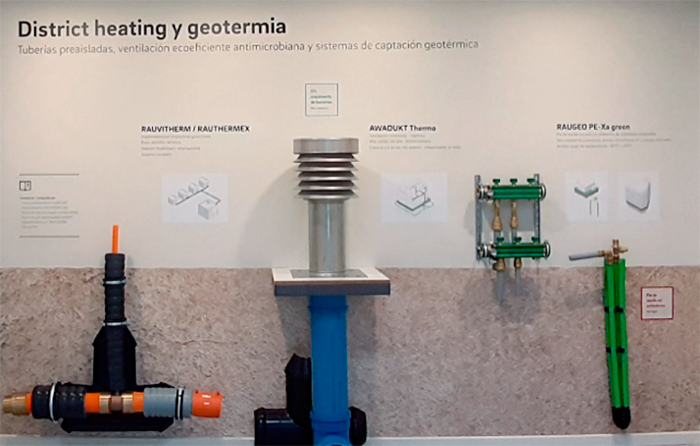 El nuevo showroom de REHAU cuenta también con un sector dedicado a sus productos de district heating y geotermia, donde se agrupan las diferentes soluciones que se instalan bajo tierra. Por un lado, se encuentran las soluciones que aprovechan la energía geotérmica, tales como AWADUKT Thermo, un sistema de tuberías antimicrobianas con un intercambiador de calor aire-tierra preconectado al aparato de ventilación, que proporciona aire limpio e higiénico al interior de las estancias. En este espacio también se encuentran las distintas aplicaciones del sistema RAUGEO PE-Xa green, que aporta soluciones alternativas para la extracción de la energía geotérmica y su uso eficiente para la calefacción y el refrescamiento mediante superficies radiantes. Por otro lado, también está expuesto el sistema de district heating o redes urbanas de calor/frío a distancia, formadas por tuberías preaisladas RAUVITHERM o RAUTHERMEX y sus accesorios de unión, que transportan la energía en forma de calor o frío para abastecer de agua potable y ACS a las estancias, para calefacciones al aire libre y para carreteras o bien para la climatización de piscinas, entre otros.
