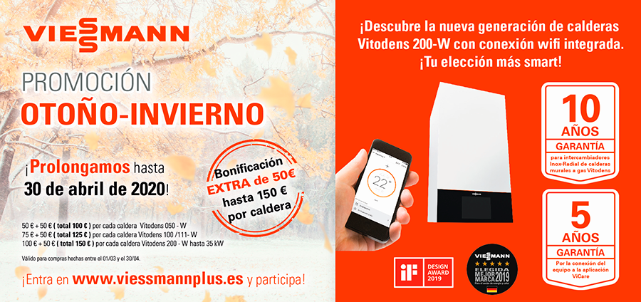Desde el 1 de Marzo hasta el 30 de Abril de 2020 Viessmann añade 50€ más a la promoción: 100€ por cada caldera Vitodens 050-W, 125€ por cada caldera Vitodens 100/111-W y 150€ por cada caldera Vitodens 200-W hasta 35 kW.