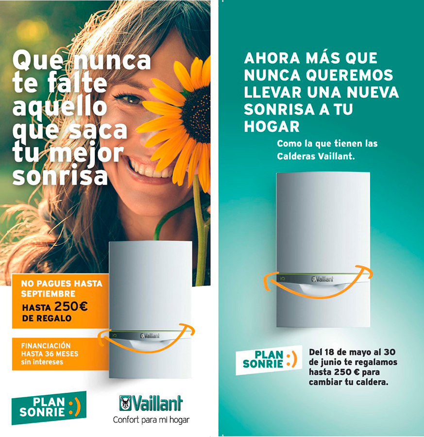 Parece que tras la situación provocada por el Covid19, poco a poco se recupera la actividad. En este camino de ‘vuelta a la normalidad’, Vaillant quiere estar junto a sus clientes y ayudarles en todo lo que sea necesario. Por ello, del 18 de mayo al 30 de junio, pone en marcha el Plan Sonrie:), por el que los usuarios que adquieran una caldera de 30 kW o más recibirán 250 € y los que adquieran algún otro modelo de la marca, 150 €. Además, todos pueden financiar su compra hasta 36 meses sin intereses y comenzar a pagar en septiembre.