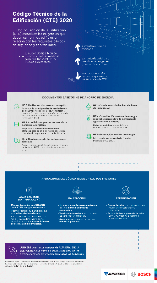 Una de las principales novedades de esta nueva legislación es la definición según las zonas climáticas de los patrones de demanda en cuanto a calefacción, refrigeración y agua caliente sanitaria. En este sentido, Junkers cuenta con una amplia gama de soluciones que fomentan el uso eficiente de la energía y apuestan por el cuidado del medio ambiente. Soluciones punteras que cuentan con tecnología de última generación para cubrir las demandas con equipos de elevada eficiencia energética.