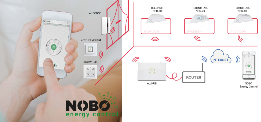 Con el sistema de control remoto a través de la App NOBO Energy Control es posible controlar los radiadores eléctricos noruegos NOBO by Dimplex a través de smartphone o Tablet. Los componentes del sistema de control remoto NOBO Energy Control son fáciles y veloces de instalar. Es suficiente poseer una conexión a internet a través de router.