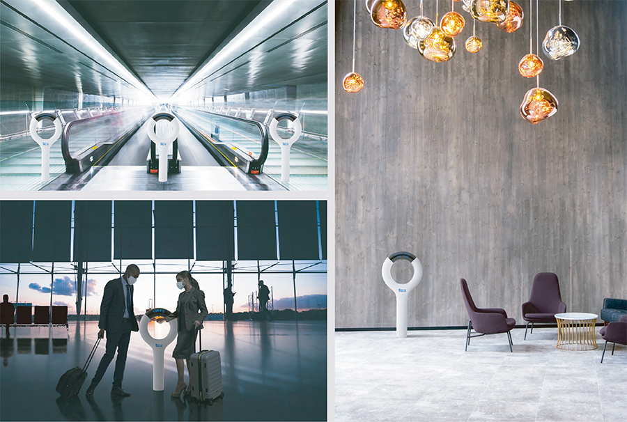 • “OM” (Rafael Vinader, España): tótem sanitario con dispensador automático de gel hidroalcohólico desinfectante y termómetro por infrarrojos.