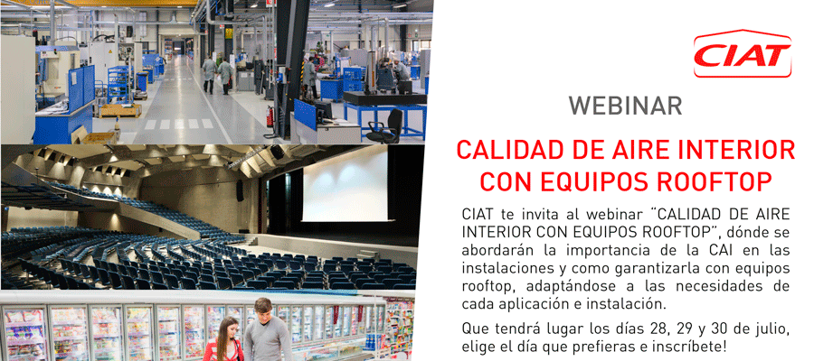 CIAT te invita al webinar "CALIDAD DE AIRE INTERIOR CON EQUIPOS ROOFTOP", dónde se abordarán la importancia de la CAI en las instalaciones y como garantizarla con equipos rooftop, adaptándose a las necesidades de cada aplicación e instalación.