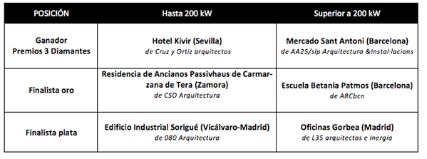 Los grandes protagonistas de esta edición se han distinguido en dos categorías: Proyectos hasta 200 kW y Proyectos superiores a 200 kW, con lo que este año -como novedad e intentando dar visibilidad a un mayor número de proyectos a destacar por su excelente nivel de eficiencia - contamos con dos Ganadores Premios 3 Diamantes, dos Finalistas Oro y dos Finalistas Plata, y que se repartirán una dotación económica de 35.000 €.