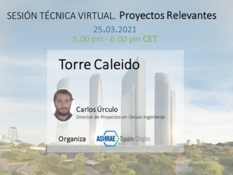 En esta primera presentación, Carlos Úrculo, MASHRAE y Socio de Úrculo Ingenieros, expondrá el proyecto del quinto rascacielos que completa el skyline del distrito financiero de Madrid – Torre Caleido. Desde la complejidad en altura hasta los distintos tratamientos aplicados a cada espacio y en función de su utilización y requerimientos, Carlos nos mostrará las diferentes soluciones técnicas adoptadas, así como aquellos aspectos, técnicamente, novedosos o complejos. Las consideraciones energéticas y su optimización estarán presentes a lo largo de su exposición.
