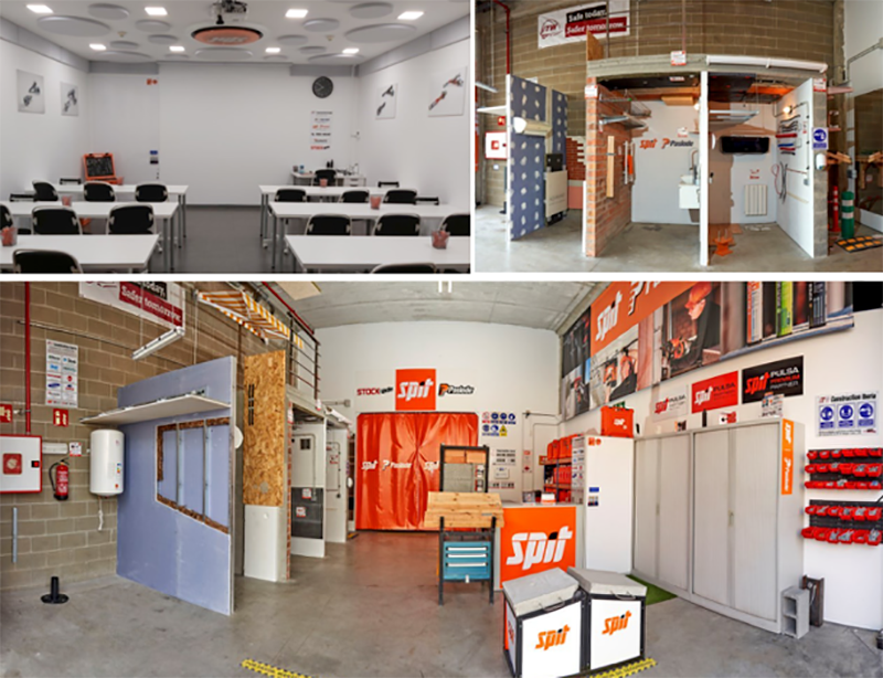 • Aula práctica, en la que se pueden probar e instalar todos nuestros productos, desde las fijaciones mecánicas y químicas, las herramientas electro portátiles, las clavadoras de gas y pólvora, hasta los motores de diamante. Cuenta con EPI de todo tipo, tanto los intrínsecos para la realización de instalaciones y manipulación de herramientas, como frente a la COVID.