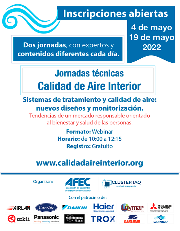 Los próximos días 4 y 19 de mayo, en horario de 10:00 a 12:15 horas, tendrán lugar las dos jornadas técnicas en formato virtual, con expertos y contenidos diferentes cada día. La asistencia es gratuita previo registro a través de la página http://calidadaireinterior.org/, en la cual se puede encontrar el avance de programa, que contará con la participación de AIRLAN, CARRIER, DAIKIN, HAIER, LUYMAR, MITSUBISHI ELECTRIC, ORKLI, PANASONIC, SODECA, TROX, URSA y VENFILTER.