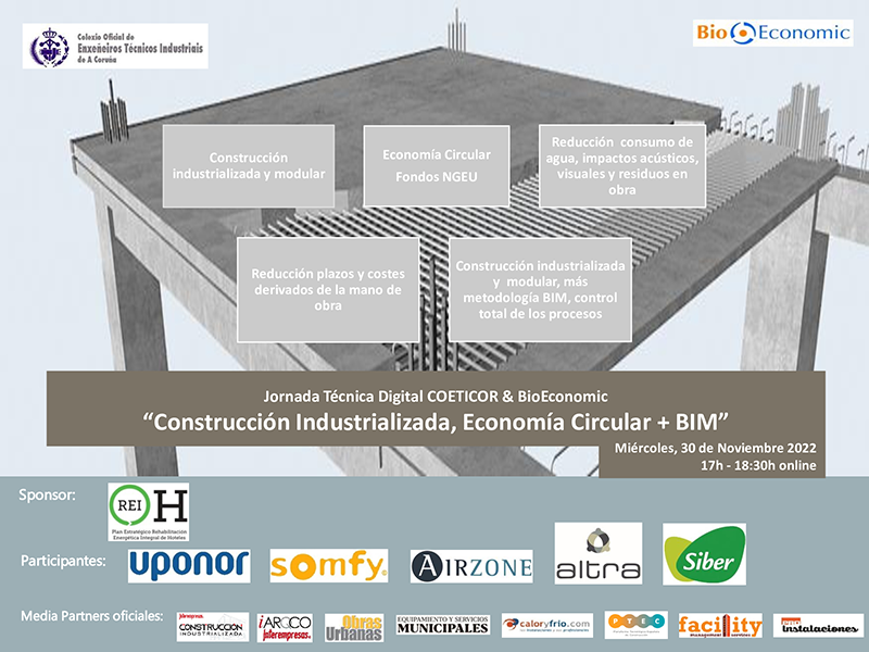 El 30 de Noviembre el COETICOR, Colexio Oficial de Enxeñeiros Técnicos Industriais de A Coruña y BioEconomic, organizan la Jornada Técnica Online sobre la Construcción Industrializada, Economía Circular + BIM, con soluciones técnicas, casos prácticos y de éxito ya aplicados. Con el Patrocinio del Plan REIH.
