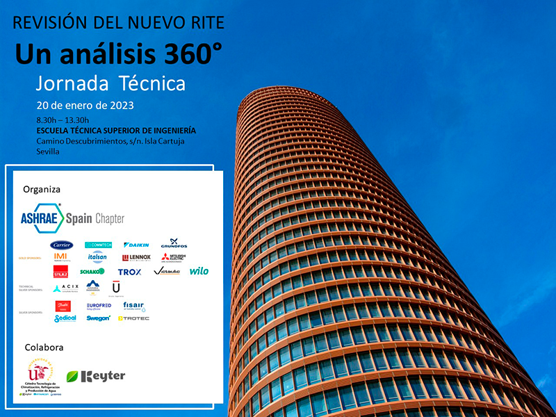 ASHRAE SPAIN CHAPTER y KEYTER en colaboración con la Cátedra de Tecnología de Climatización, Refrigeración y Producción de Agua de la Universidad de Sevilla de Keyter Intarcon Genaq organizan una jornada el próximo 20 de enero en el Salón de Grados de la Escuela Técnica Superior de Ingenieros de Sevilla donde se tratará de la mano de expertos del sector la última revisión del RITE (Reglamento de Instalaciones Térmicas en Edificios) donde se hace mayor hincapié en el uso de energías renovables, aprovechamiento de energías residuales, mejora de la regulación y control de los edificios, optimización del aislamiento así como cambios en la operativa y mantenimiento de las instalaciones que está provocando ya una mejora del parque nacional de inmuebles existentes.