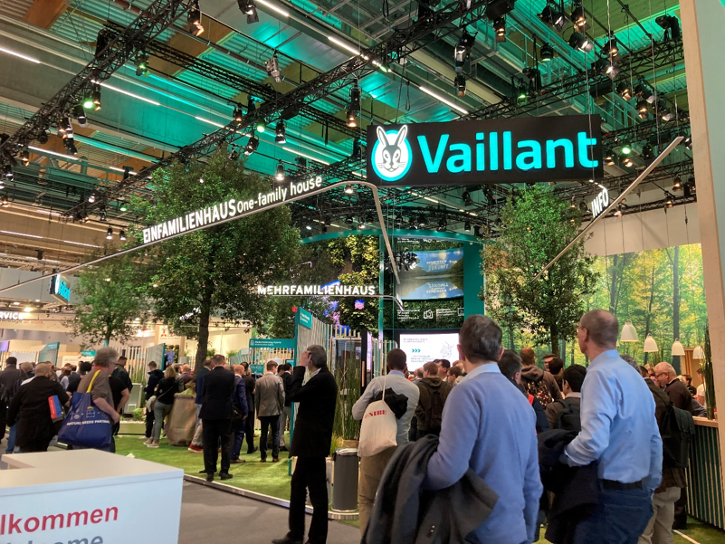 Vaillant ha destacado entre los expositores participantes con un moderno y original stand que representaba a la perfección la apuesta de la marca por la eficiencia y sostenibilidad. Presidido por varios árboles naturales de gran tamaño y vegetación natural, el stand de Vaillant giraba en torno a un mensaje claro: el empleo de tecnologías respetuosas con el medio ambiente para una transición hacia una calefacción más sostenible.