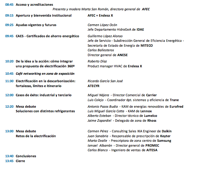 En cuanto al papel de la electrificación en la descarbonización, Endesa X explicará cómo integrar una propuesta de electrificación 360º, con soluciones adaptadas a cada caso, y ATECYR repasará las fortalezas, limitaciones e itinerarios.