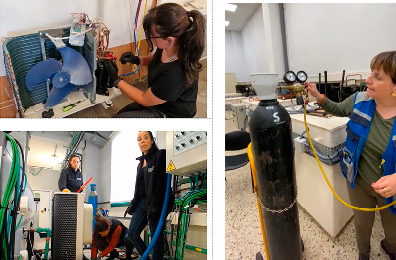 - Tres mujeres trabajando en equipo, Amaiur Berra, Eider Berridi y Anabel García, profesoras en el departamento de instalación y mantenimiento del centro de formación profesional USURBIL LHII en Guipúzcoa. Han preparado un video sobre "DIAGNÓSTICO, DETECCIÓN Y REPARACIÓN DE UN AFUGA EN UNA ENFRIADORA DE CO2 TRANSCRÍTICO PARA UNA UNIDAD DE TRATAMIENTO INTEGRADO DE AIRE”
