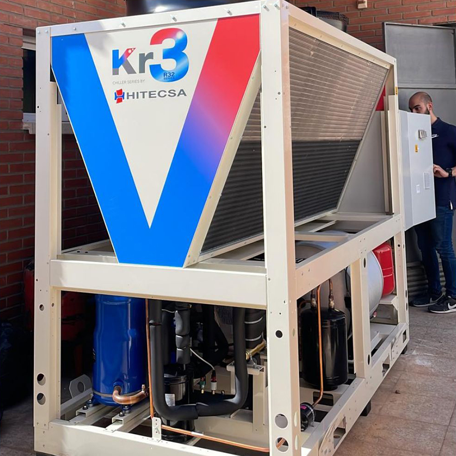 Han elegido dos bombas de calor, un roof-top aire-aire Kubic Next KuNBi 75 y una unidad aire-agua Krono 3 Kr3B 40. El RT Kubic Next con RCF es ideal para instalar en el exterior (azoteas, cubiertas, etc.) de grandes superficies con conductos de aire. Por otro lado, la Bomba de Calor Aire-Agua Krono 3 es un paso adelante en la climatización mediante sistemas hidrónicos, ya que utiliza el agua como fluido caloportador y un refrigerante de bajo PCA, con el claro objetivo de contribuir a minimizar el impacto medioambiental.