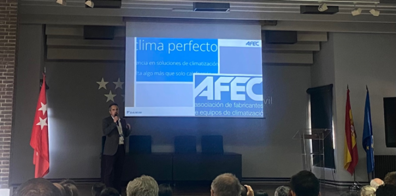 Representando a AFEC estuvo Marcos Casas, Adjunto a la dirección de servicio control, monitorización, remota y energía de Daikin, quien comenzó su sesión destacando la importancia y el alto impacto de la climatización en nuestra sociedad, dado que, en términos de consumo de energía doméstico, es el 60% de la factura, superándose en el sector comercial, y llegándose a un 75% en el caso, por ejemplo, de hoteles.