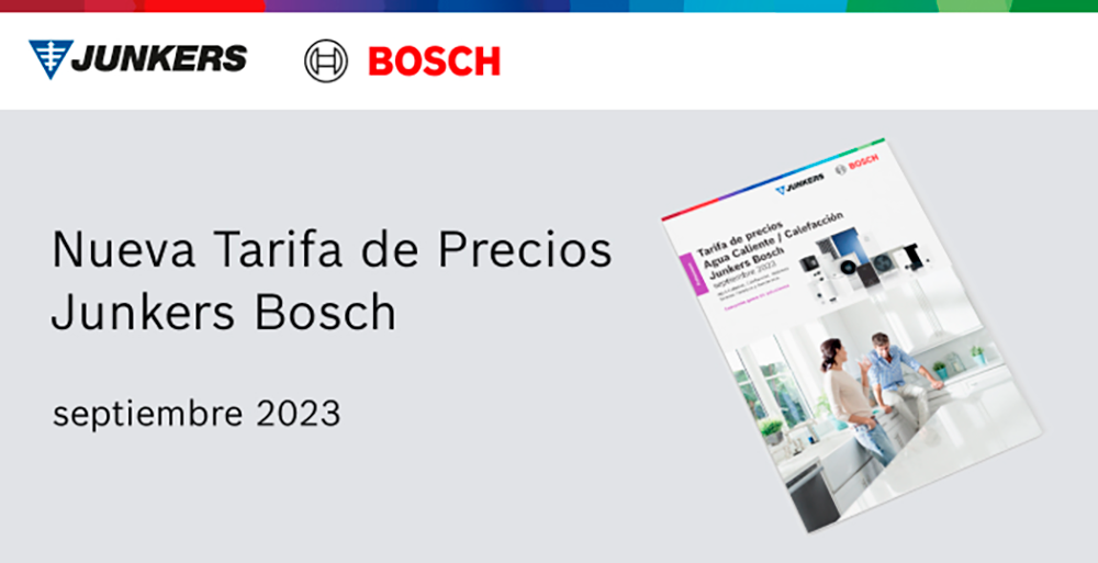 Junkers Bosch presenta su nueva tarifa de precios edición septiembre 2023 para productos residenciales de agua caliente, calefacción, aerotermia y sistemas solares térmicos, que se encuentra en vigor desde el 5 de septiembre. Un completo porfolio de productos con soluciones que destacan por su tecnología, eficiencia e innovación.