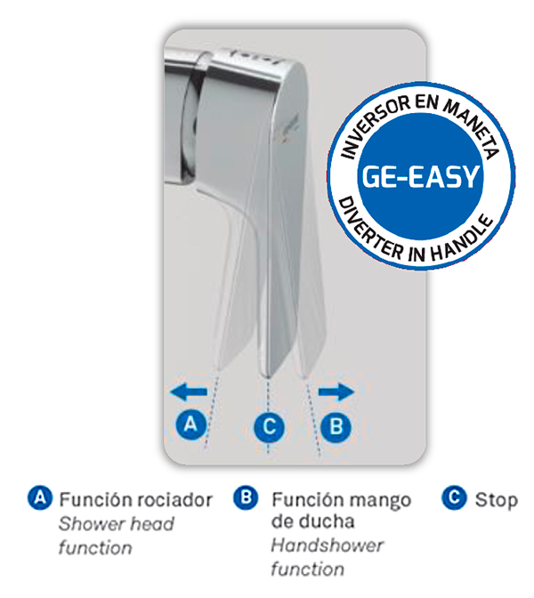 A nivel técnico, la característica más destacada de este producto es el sistema GE-EASY, propio de Genebre, que consta de un innovador modo de doble función en la maneta. Desde la maneta podemos accionar el rociador o el mango de ducha, es decir, el producto incluye la función de inversor en el propio cartucho evitando así un inversor externo o un segundo mando y su control único también permite regular la temperatura y el caudal.