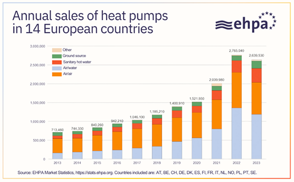 Las ventas de bombas de calor en 14 países europeos cayeron en conjunto alrededor de un 5% en 2023 respecto a 2022, pasando de 2,77 millones a 2,64 millones
