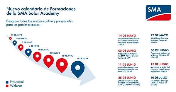 De esta manera, la agenda comienza el mes de mayo con el webinar, "Aprende a dimensionar tu sistema fotovoltaico con SMA Sunny Design 5.61.3” (14 de mayo), y la formación presencial, “SMA Home Storage Solution: Puesta en Marcha” (22 de mayo). Por su parte, junio cuenta con una amplia oferta de seminarios online: “Propuesta de Valor de las SMA Power Station hasta 4,6 MW” (5 de junio), “Aprende a monitorizar la instalación solar con EnnexOS Portal” (11 de junio), “Maximiza el valor del Proyecto con el Sunny Highpower PEAK3” (13 de junio) y “Conoce las características únicas de los equipos de SMA (Shadefix, Arcfix, Smart Connected)” (25 de junio). Por último, esta nueva fase formativa finaliza en julio con una nueva sesión del seminario, “SMA Home Storage Solution: Puesta en marcha” (10 de julio).