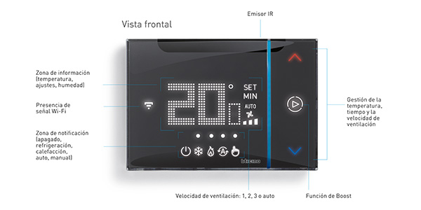 *El Smarther AC with Netatmo es compatible con cualquier aire acondicionado funcionando con un mando a distancia que muestre todos los ajustes en su pantalla. Si hay más de una unidad en la estancia, deben ser del mismo modelo y marca. Deberá instalarse como máximo 1 unidad del termostato conectado en cada estancia, con un máximo de 10 por vivienda y 10 viviendas por cuenta.