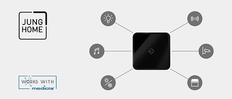 Por otro lado, la integración con el ecosistema mediola® expande aún más las capacidades de JUNG HOME. Productos de domótica para el hogar de marcas como Netatmo, Nuki, LG, Sonos y Philips Hue pueden integrarse mediante el uso del dispositivo de red (hub) mediola® AIO Gateway. La interacción entre el usuario y los diversos aparatos del hogar se realiza mediante la app IQontrol Neo, la cual se puede instalar en cualquier smartphone. Dispone de una interfaz de usuario extremadamente intuitiva y fácil de usar, ideal tanto para usuarios finales como para profesionales.
