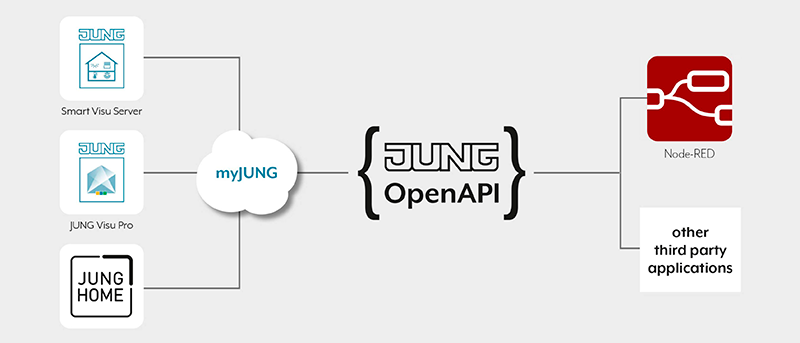 Para los desarrolladores, la OpenAPI de JUNG significa una simplificación considerable y un aumento de la eficiencia en su trabajo. En lugar de tener que desarrollar aplicaciones separadas para JUNG HOME, Smart Visu Server y Visu Pro Server, la API permite un desarrollo único que puede integrarse a la perfección en las tres plataformas.