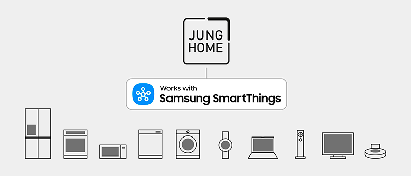 Asimismo, la conexión del JUNG HOME gateway con la app SmartThings de Samsung permite controlar una amplia variedad de dispositivos inteligentes, desde lámparas hasta televisores o incluso aspiradoras robóticas, utilizando un smartphone, un smartwatch o comandos de voz. Está disponible tanto para Android como para iOS.