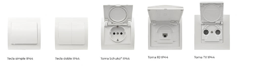La novedad de IP44 supone protección versátil para la mayoría de las series, funciones adaptables, una amplia variedad de colores y marcos personalizables para hasta cinco elementos, combinando diseño y resistencia en cualquier espacio