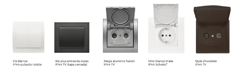 - Versatilidad para la mayoría de sus series: las series Iris, Iris Plus, Mega, Style y Miro ahora cuentan con protección IP44, permitiendo a los usuarios llevar la misma estética y calidad de diseño de sus mecanismos interiores al exterior de la vivienda, ampliando sus opciones de instalación.