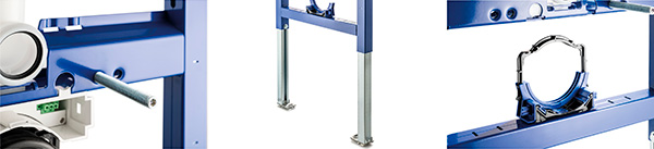 - Marcas adicionales. Nuevas marcas en el bastidor azul facilitan la medición del eje de las varillas roscadas y del centro del codo de evacuación. Sin pegatinas que se pueden caer o manchar.