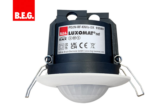 El modelo PD2N-RF-KNXs-DX-FT de B.E.G. es un detector de presencia inalámbrico de alta calidad especialmente útil en proyectos de renovación de edificios donde se busca evitar cableado adicional. Destaca por su bajo consumo energético y porque incorpora sensores PIR que permiten gestionar de forma inteligente y automatizada los sistemas de iluminación, climatización y ventilación. Basándose en la ocupación real del espacio y en las condiciones ambientales del entorno, posee un ángulo de detección de 360º y un rango operativo de hasta 10 metros de altura,