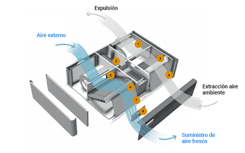 En los equipos horizontales, el aire exterior es captado directamente a través de un ventilador de velocidad variable (5) y conducido a la batería de tratamiento (6) donde es filtrado (7) y calentado o enfriado según el modo de funcionamiento, antes de ser inyectado en el interior del local a ventilar. Al mismo tiempo y en la misma cantidad, el aire del interior del local es captado por la rejilla de aspiración, y tras ser filtrado (4) se le extrae el calor (o frío) que contenía en la batería de tratamiento (3). El calor se recupera y se devuelve local ventilado mientras que el aire viciado se expulsa al exterior (1).