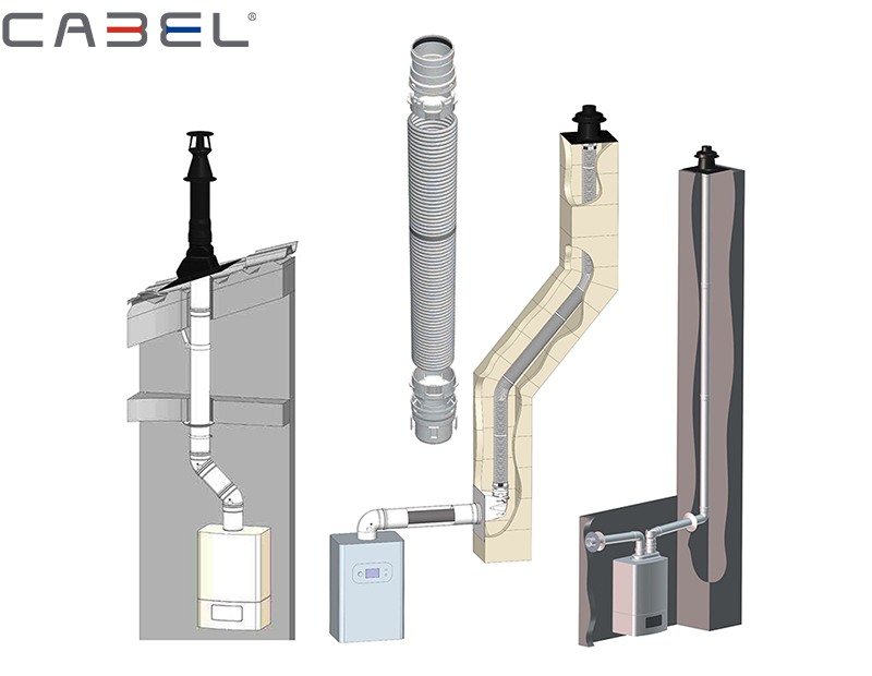 Las nuevas gamas de chimeneas CABEL, certificadas según la norma UNE-EN 14471:2013+A1:2016, son recortables a la medida de cada instalación y están diseñadas para absorber las posibles dilataciones durante el funcionamiento de la caldera. Asimismo, cada gama se completa con codos de 45º y 87º, varios terminales de techo y horizontales, deflectores de aspiración y evacuación, plafones, abrazaderas, manguitos, juntas de estanqueidad de EPDM (caucho de etileno propileno dieno), etc.