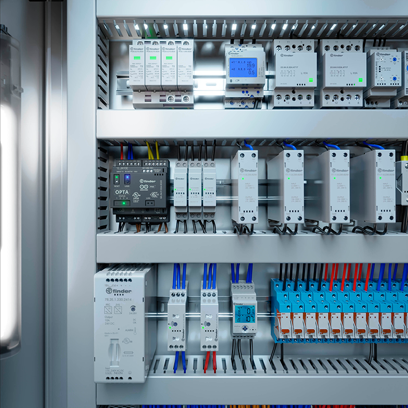 La interoperabilidad con los dispositivos Finder existentes también es sencilla. Contadores de energía, contactores, fuentes de alimentación conmutadas, relés y muchos otros dispositivos se pueden conectar a OPTA, manteniendo todo bajo control localmente a través de HMI o de forma remota gracias a los paneles en tiempo real que se pueden crear con la intuitiva plataforma Arduino Cloud (o servicios de terceros).
