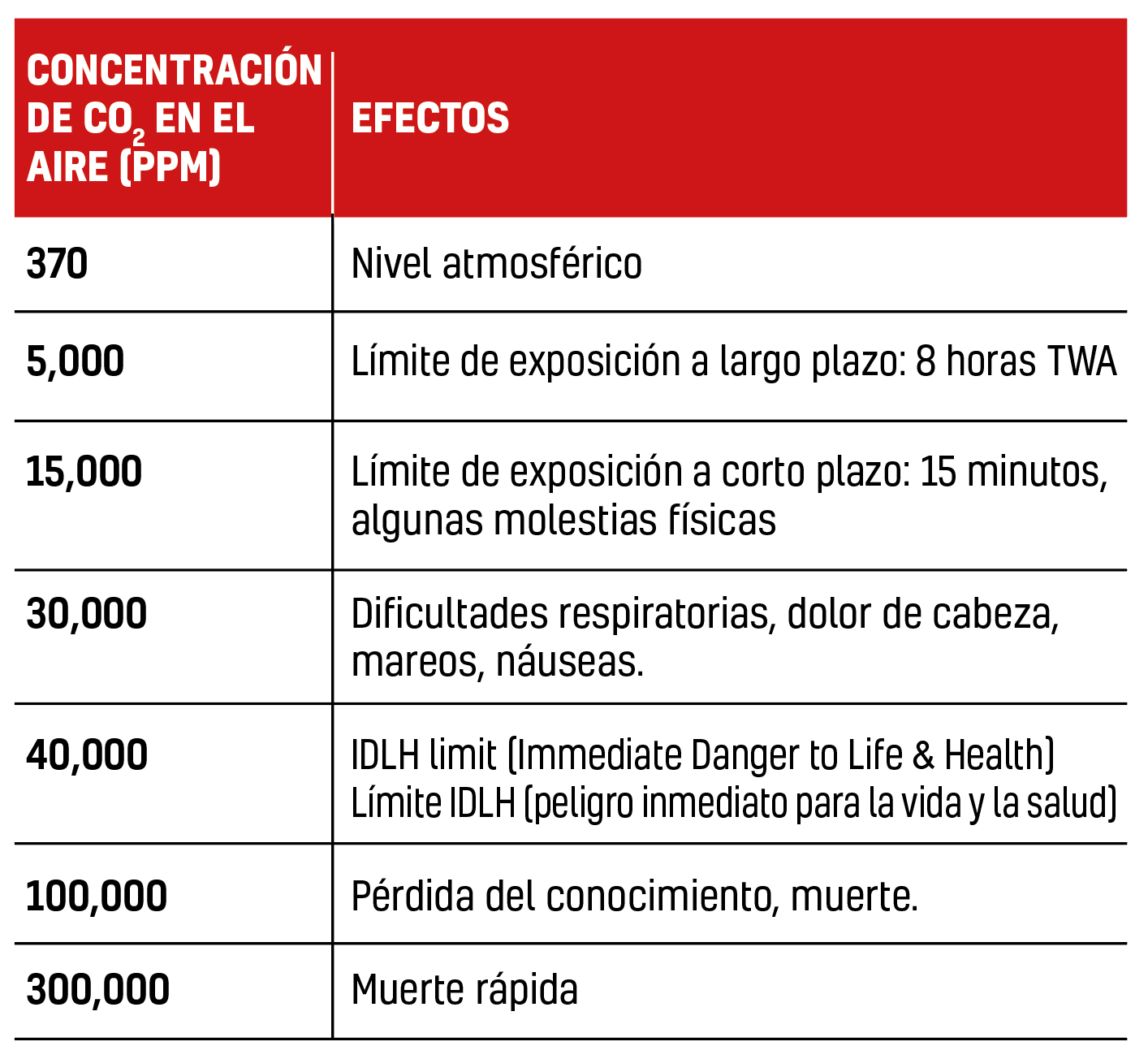 Los peligros potenciales del CO2 en una aplicación de venta minorista de alimentos son muy reales. Por ejemplo, en un sistema de refrigeración que utiliza CO2 como refrigerante, en una cámara frigorífica típica con un volumen de 25 m3 y una tasa de intercambio de aire por hora, podemos calcular que una tasa de fuga de 500 g/h creará una atmósfera que contiene 40.793 ppm de CO2 en sólo 250 segundos. Esto supera el nivel de 40.000 ppm en el que el CO2 representa un peligro inmediato para la vida y la salud según las directrices de OSHA.