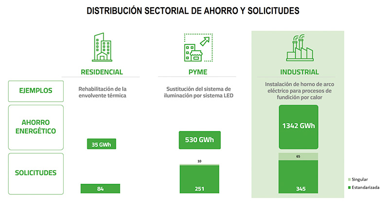 Por sectores, el industrial ha sido el que ha optado en mayor medida por monetizar sus ahorros energéticos e impulsar su competitividad con 410 solicitudes (54% del total) y una reducción de consumo de energía de 1.342 GWh (70,4% del total), seguido por el sector terciario, con 256 actuaciones (35%) y 530 GWh de ahorro (27,8%), y el residencial, con 84 (11%) y 35 GWh (1,8%).