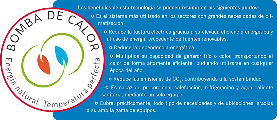 Se puede, igualmente, afirmar que esta tecnología es capaz de proporcionar, de forma gratuita, al menos, el 60% de la energía necesaria para climatización. Esto es posible gracias a que, en invierno, los equipos transfieren el calor natural del aire, el agua o la tierra hacia el interior del recinto creando un ambiente cálido y acogedor y, en verano, enfrían el recinto transfiriendo el calor del interior hacia el exterior, proporcionado un ambiente fresco y agradable, y todo esto se hace de una forma muy eficiente, ya que son capaces de transportar mucho más calor que la energía que consumen.