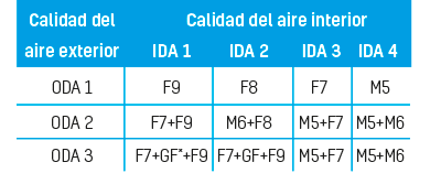 El RITE mediante la Instrucción Técnica 1.1.4.2.4, define los niveles de filtración mínima que se deberán incluir en la aportación de aire exterior, y que son función del tipo de uso del local y la calidad del aire exterior.