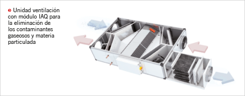 Solución: Tecnologías como el uso de materiales absorbentes (especiales formulaciones de carbón activo) o lámparas UV permiten conseguir una elevada eficiencia en la eliminación de estos contaminantes. Ejemplo de unidad ventilación con módulo IAQ para la eliminación de los contaminantes gaseosos.
