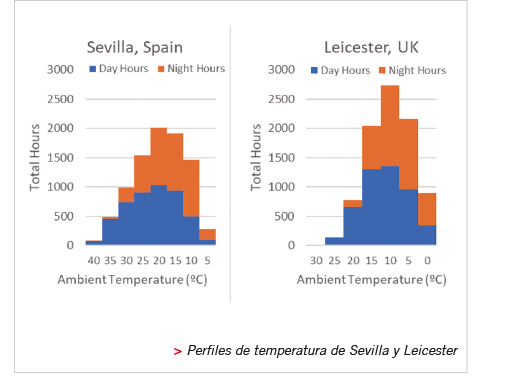 Dicho estudio se aplicó en estas dos situaciones: en un clima europeo templado (Leicester, Reino Unido) y en un clima europeo cálido (Sevilla, España) para comparar, objetivamente, la eficiencia de dichas tecnologías.